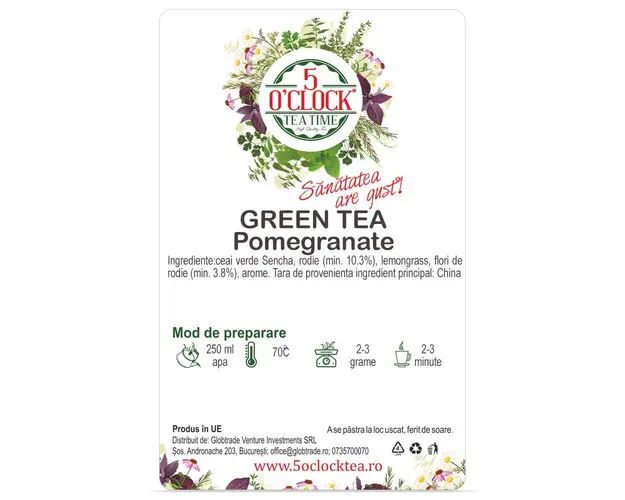 Ceaiul verde are numeroase proprietati asupra sanatatii, iar cand il savurezi intr-o infuzie imbogatita cu rodie, experienta este cu adevarat una speciala. Pomegranate este un ceai verde Sencha in care vei remarca aroma de rodie, complimentata de gustul revigorant de lemongrass. Ingrediente: ceai verde Sencha, rodie (min. 10.3%), lemongrass, flori de rodie (min. 3.8%), arome. Tara de provenienta ingredient principal: China. Produs in UE. Merge cu: deserturi, preparate usoare pe baza de pui. Recomandari de servire: In cazul suprainfuzarii, ceaiurile verzi si albe pot capata un gust usor amarui. Pentru o aroma mai puternica, poti folosi o cantitate mai mare de ceai in locul cresterii duratei de infuzare. Mod de Preparare: Pentru a prepara o ceasca de ceai, adaugati apa fierbinte ( 70C) peste o lingurita cu ceai (aproximativ 2 gr) si lasati la infuzat timp de 2-3 minute. Dozaj portie 2 grame Temperatura apa 70C Timp de preparare 2-3 minute Valori nutritionale Per 100g Nivel teina Energie (kj/kcal) 0/0 Grasimi 0g din care acizi grasi saturati 0g Carbohidrati 0g din care zaharuri 0g Proteine 0g Sare 0g Produsul cu denumirea Pomegranate (Gramaj: 100g) face parte din brandul , se afla in categoria Tip cafea si subcategoria