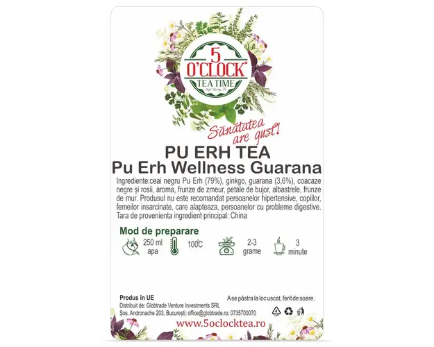 Ritmul tot mai alert al vietii de zi cu zi ne face uneori sa ne gandim ca suntem intotdeauna in criza de timp. De fapt, ceea ce ne lipseste nu este neaparat timpul, ci energia. Daca si tu esti implicat in foarte multe activitati, stunci cu siguranta ai nevoie de foarte multa energie. Cel mai sanatos mod de a-ti incarca bateriile, pe langa un somn bun, sunt ceaiurile cu efect energizant. Ceaiul negru Pu Erh este recunoscut pentru taria pe care o prezinta, fiind unul dintre cele mai energizante tipuri de ceai. Guarana este o planta la care apeleaza in special locuitorii tarilor din America de Sud datorita efectului energizant pe care il are. In combinatie cu Pu Erh si ginkgo biloba avem un cocktail natural care ne ofera energia de care avem nevoie! Ceaiul negru Pu Erh Wellness Guarana este imbogatit si cu coacaze negre si rosii si petale de flori, astfel ca si gustul sau este extraordinar. Ingrediente: ceai negru Pu Erh (79%), ginkgo, guarana (3,6%), coacaze negre si rosii, aroma, frunze de zmeur, petale de bujor, albastrele, frunze de mur. Produsul nu este recomandat persoanelor hipertensive, copiilor, femeilor insarcinate, care alapteaza, persoanelor cu probleme digestive. Tara de provenienta ingredient principal: China. Produs in UE . Merge cu: pui, mancaruri prajite. Recomandari de servire: Intrucat ceaiul negru are un gust mai puternic, poti adauga in ceai o cantitate foarte mica de lapte. Mod de Preparare: Pentru prepararea unei cesti de ceai, adaugati apa fierbinte ( 100C) peste o lingurita cu ceai (aproximativ 2 gr) si lasati la infuzat timp de 3 minute. Dozaj portie 2 grame Temperatura apa 100C Timp de preparare 3 minute Valori nutritionale Per 100g Nivel teina Energie (kj/kcal) 0/0 Grasimi 0g din care acizi grasi saturati 0g Carbohidrati 0g din care zaharuri 0g Proteine 0g Sare 0g Produsul cu denumirea Pu Erh Wellness Guarana (Gramaj: 200g) face parte din brandul , se afla in categoria Tip cafea si subcategoria