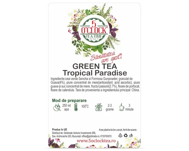 Un mix de ceai verde chinezesc cu Formosa Gunpowder, lamaie revigoranta, guava si fructul pasiunii cu accente florale de galbenele si flori de portocal ce te va surprinde prin aroma exotica extrem de placuta si racoritoare. Are un continut ridicat de antioxidanti ce contribuie la combaterea efectelor radicalilor liberi. In plus, poate contribui la mentinerea sanatatii tenului si ne ajuta sa ne relaxam, cu toate ca are un continut moderat de teina. Ingrediente: ceai verde Sencha si Formosa Gunpowder, granulat de Guava(4%), piure concentrat de mere(antioxidant: acid ascorbic), piure guava si suc concentrat de mere, fructul pasiunii(2.7%), floare de portocal, floare de calendula. Tara de provenienta a ingredientului principal: China. Produs in UE. Merge cu: paste, quiche. Recomandari de servire: In cazul suprainfuzarii, ceaiurile verzi si albe pot capata un gust usor amarui. Pentru o aroma mai puternica, poti folosi o cantitate mai mare de ceai in locul cresterii duratei de infuzare. Mod de Preparare: Pentru prepararea unei cesti de ceai, adaugati apa fierbinte ( 100C) peste o lingurita cu ceai (aproximativ 2 gr) si lasati la infuzat timp de 3 minute. Dozaj portie 2 grame Temperatura apa 100C Timp de preparare 3 minute Valori nutritionale Per 100g Nivel teina Energie (kj/kcal) 18/4 Grasimi 0g din care acizi grasi saturati 0g Carbohidrati 0g din care zaharuri 0g Proteine 0g Sare 0.03g Produsul cu denumirea Tropical Paradise (Gramaj: 50g) face parte din brandul , se afla in categoria Tip cafea si subcategoria