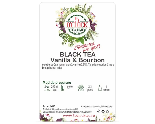 Ceaiul negru cu vanilie este unul dintre cele mai vechi ceaiuri aromate. Mireasma delicata si senzuala a vaniliei contrasteaza perfect cu taria ceaiului negru, pentru a da nastere unei bauturi delicioase si parfumate. Ceaul negru Vanilla & Bourbon este ideal de savurat dupa masa de pranz, in locul desertului si al cafelei: iti ofera energia de care ai nevoie in timpul dupa-amiezei si savoarea unui desert, fara caloriile amenintatoare pentru silueta! Ingrediente: Ceai negru, aroma, vanilie (0,9%). Tara de provenienta ingredient principal: India. Produs in UE. Merge cu: deserturi, foietaje. Recomandari de servire: Intrucat ceaiul negru are un gust mai puternic, poti adauga in ceai o cantitate foarte mica de lapte. Mod de Preparare: Pentru prepararea unei cesti de ceai, adaugati apa fierbinte ( 100C) peste o lingurita cu ceai (aproximativ 2 gr) si lasati la infuzat timp de 3 minute. Dozaj portie 2 grame Temperatura apa 100C Timp de preparare 3 minute Valori nutritionale Per 100g Nivel teina Energie (kj/kcal) 0/0 Grasimi 0g din care acizi grasi saturati 0g Carbohidrati 0g din care zaharuri 0g Proteine 0g Sare 0g Produsul cu denumirea Vanilla & Bourbon (Gramaj: 100g) face parte din brandul , se afla in categoria Tip cafea si subcategoria