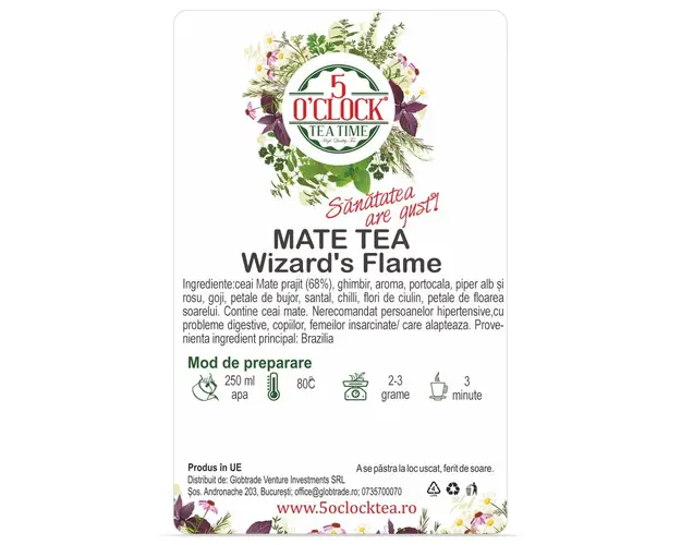 Daca ai nevoie de un ceai energizant, iti recomandam ceaiul Mate. Daca chiar ai nevoie de un ceai energizant, iti recomandam ceaiul Mate Wizard's Flames! Ceaiul Mate este cel mai energizant tip de ceai, continutul de cafeina apropiindu-se de cel al cafelei, insa Wizard's Flames contine si alte ingrediente care pun sangele in miscare si planurile in aplicare: ghimbir, piper si chilli, ingrediente cu efect revigorant. In plus, acest sortiment de ceai Mate este imbogatit si cu felii de portocala si goji, pentru un plus de energie. Gustul este senzational, iar efectul energizant, pe masura! Ingrediente: ceai Mate prajit (68%), ghimbir, aroma, portocala, piper alb si rosu, goji, petale de bujor, santal, chilli, flori de ciulin, petale de floarea soarelui. Contine ceai mate. Nerecomandat persoanelor hipertensive,cu probleme digestive, copiilor, femeilor insarcinate/ care alapteaza. Provenienta ingredient principal: Brazilia. Produs in UE. Merge cu: salate usoare. Recomandari de servire: Cea mai cunoscuta metoda de preparare a ceaiului Mate include doua accesorii speciale: bol si bombilla. Mod de Preparare: Se pune o lingurita de frunze de ceai in recipient si se agita putin pentru a se desprinde din ele particule mai mici. Apoi, se infuzeaza timp de 3-4 minute cu apa la temperatura de 80C. Se poate reinfuza de mai multe ori, pana cand infuzia isi pierde aroma. Dozaj portie 2 grame Temperatura apa 80C Timp de preparare 3 minute Valori nutritionale Per 100g Nivel teina Energie (kj/kcal) 0/0 Grasimi 0g din care acizi grasi saturati 0g Carbohidrati 0g din care zaharuri 0g Proteine 0g Sare 0g Produsul cu denumirea Wizard's Flame (Gramaj: 100g) face parte din brandul , se afla in categoria Tip cafea si subcategoria