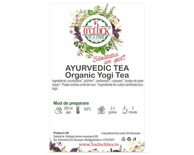 Pasionatii de Ayurveda cunosc importanta ceaiurilor pentru sanatatea corpului si a mintii. Yogi este o infuzie revigoranta preparata numai din ingrediente certificate organic, perfecta pentru pauzele pe care le iei in activitatea ta zilnica si pe care le folosesti pentru a-ti gasi echilibrul in viata. Ingrediente: scortisoara*, ghimbir*, cardamom*, cuisoare*, boabe de piper negru*. Poate contine urme de nuci. *Ingrediente din culturi certificate ecologic.Produs in UE. Merge cu: deserturi pe baza de fructe. Recomandari de servire: Pentru a imbogati si mai mult gustul adauga o felie de lamaie sau de portocala, sau putina scortisoara. Mod de Preparare: Pentru a prepara o ceasca de ceai, adaugati apa fierbinte ( 100C) peste o lingurita cu ceai (aproximativ 2-2.5 gr) si lasati la infuzat timp de 8-10 minute. Dozaj portie 2-2.5 grame Temperatura apa 100C Timp de preparare 8-10 minute Valori nutritionale Per 100g Nivel teina Energie (kj/kcal) 0/0 Grasimi 0g din care acizi grasi saturati 0g Carbohidrati 0g din care zaharuri 0g Proteine 0g Sare 0g Produsul cu denumirea Yogi Tea (Gramaj: 100g) face parte din brandul , se afla in categoria Tip cafea si subcategoria