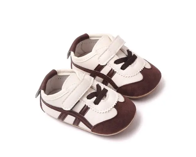 Marimi: 3 -6 luni ( lungime talpita la interior 10,5 cm, lungime talpita la exterior 11 cm) 6-9 luni ( lungime talpita la interior 11,5 cm, lungime talpita la exterior 12 cm) 9-12 luni (lungime talpita la interior 12,5 cm, lungime talpita la exterior 13 cm) Adidasi pentru baietei, se inchid cu sireturi din elastic si bareta cu arici intr-o parte. Culoare: ivoire cu insertii maro Material: tip piele ecologica Talpa: cauciuc moale antiderapant Produsul cu denumirea Adidasi ivoire cu maro pentru baietei face parte din brandul Eurobaby, se afla in categoria Barbie si subcategoria