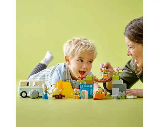 Umple sesiunile de joaca cu ore de invaţare vesela cu setul LEGO® DUPLO® Disney Mickey and Friends Aventura in camping (10997). Plina de activitaţi creative, aceasta jucarie de construcţie ii ajuta pe micuţii de 2+ ani sa inveţe despre rezilienţa şi munca in echipa in timpul excursiilor palpitante cu cortul alaturi de personajul Disney Daisy Duck şi nepoţii sai.Set construibil care dezvolta imaginaţiaCei mici pornesc intr-o aventura in mijlocul naturii cu Daisy Duck şi Huey, Dewey şi Louie, intr-o rulota ce poate fi condusa. Ei gasesc o harta a comorilor şi navigheaza pe rau in canoe, trecand de podul instabil care ameninţa sa rastoarne un bolovan in apa. Descopera comoara in spatele cascadei construibile, apoi fac un foc de tabara şi se adapostesc in cort.Invaţa abilitaţi pentru tot restul vieţiiCei mici dezvolta abilitaţi motorii fine construind aceasta jucarie educativa. Interpretarea in joaca a scenelor de familie ii ajuta sa inveţe despre empatie, exprimarea de sine şi colaborare, etape de dezvoltare pe care parinţii le pot observa participand la jocul animat al copiilor. Produsul cu denumirea Aventuri in camping face parte din brandul Coletto, se afla in categoria Jucarii outdoor si subcategoria Produse noi