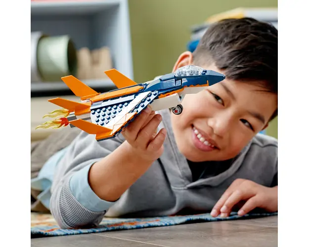 Copiii de 7 ani si mai mari se pot bucura de joaca palpitanta la mare inaltime sau pe apa cu aceasta fantastica jucarie de constructie LEGO® Creator 3 in 1 Avion supersonic (31126). Consta dintr-un avion cu reactie super rapid pentru curse aeriene, avand carlinga, roti retractabile, flacari ce ies din motor si un suport pentru expunere.Jucarii LEGO pentru joaca imaginativaIn acest set LEGO Creator 3 in 1 fanii LEGO care iubesc actiunea rapida au 3 modele autentice diferite pentru a construi si a se juca. Ei pot construi un avion cu reactie, apoi il pot reconstrui ca un elicopter sau o barca cu motor, sau pot folosi cele 215 caramizi pentru a crea propriul lor vehicul cool.O experienta digitala pentru constructorii LEGOSetul de joc include instructiuni digitale interactive de constructie pentru a face experienta si mai distractiva. Disponibile in aplicatia gratuita Instructiuni de constructie LEGO pentru smartphone-uri si tablete, instrumentele de zoom si rotire ajuta copiii sa vizualizeze modelul pe masura ce construiesc. Produsul cu denumirea Avion Supersonic face parte din brandul Coletto, se afla in categoria Jucarii outdoor si subcategoria Produse noi