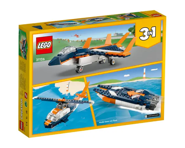 Copiii de 7 ani si mai mari se pot bucura de joaca palpitanta la mare inaltime sau pe apa cu aceasta fantastica jucarie de constructie LEGO® Creator 3 in 1 Avion supersonic (31126). Consta dintr-un avion cu reactie super rapid pentru curse aeriene, avand carlinga, roti retractabile, flacari ce ies din motor si un suport pentru expunere.Jucarii LEGO pentru joaca imaginativaIn acest set LEGO Creator 3 in 1 fanii LEGO care iubesc actiunea rapida au 3 modele autentice diferite pentru a construi si a se juca. Ei pot construi un avion cu reactie, apoi il pot reconstrui ca un elicopter sau o barca cu motor, sau pot folosi cele 215 caramizi pentru a crea propriul lor vehicul cool.O experienta digitala pentru constructorii LEGOSetul de joc include instructiuni digitale interactive de constructie pentru a face experienta si mai distractiva. Disponibile in aplicatia gratuita Instructiuni de constructie LEGO pentru smartphone-uri si tablete, instrumentele de zoom si rotire ajuta copiii sa vizualizeze modelul pe masura ce construiesc. Produsul cu denumirea Avion Supersonic face parte din brandul Coletto, se afla in categoria Jucarii outdoor si subcategoria Produse noi