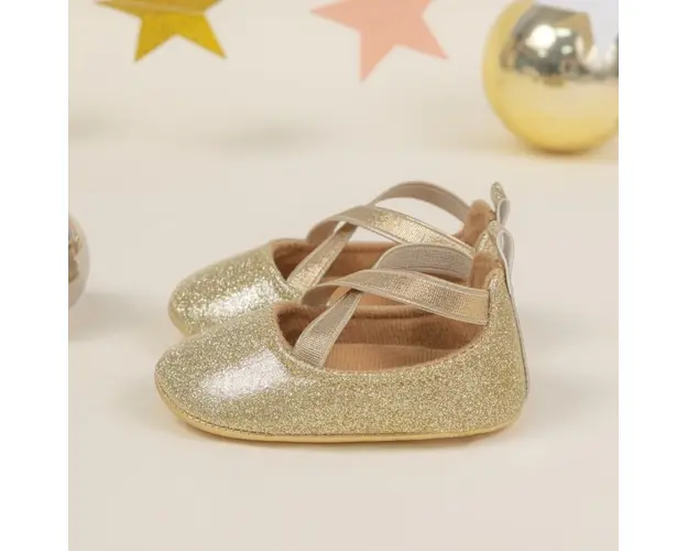Marimi: 3 -6 luni (lungime talpita la interior 10,5 cm, lungime talpita la exterior 11 cm) 6-9 luni (lungime talpita la interior 11,6 cm, lungime talpita la exterior 12 cm) 9-12 luni (lungime talpita la interior 12,7 cm, lungime talpita la exterior 13 cm) Culoare: auriu Material: piele ecologica Inchidere: barete elastice Talpa: piele ecologica cu insertie de cauciuc antiderapant Balerinii aurii stralucitori pentru bebelusi sunt perfecti pentru evenimente speciale si ocazii deosebite. Confectionati din material cu sclipici, ofera un aspect elegant si festiv. Designul tip balerina cu bretele incrucisate adauga un plus de stil si siguranta, mentinand piciorusele bebelusului confortabile si bine fixate. Talpa moale asigura libertatea de miscare si protectia necesara pentru primele pasi. Acesti pantofiori sunt ideali pentru botezuri, aniversari sau alte evenimente elegante, atragand toate privirile asupra micutei tale. Produsul cu denumirea Balerini eleganti aurii pentru bebelusi face parte din brandul Eurobaby, se afla in categoria Tetine si subcategoria