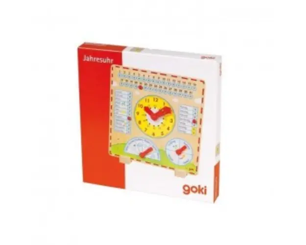 Calendar cu ceas Copiii invata prin intermediul acestui joc: anotimpurile, lunile anului, zilele saptamanii, toate in limba germana, precum si orele, minutele, chiar si vremea. Dimensiune: 35 x 35 cm Jocul ajuta la dezvoltarea miscarilor fine si a preciziei, dezvolta capacitatea de asociere si potrivire, coordonarea ochi mana si identificarea relatiilor de marime.Este un joc foarte util pentru uz individual sau pentru utilizarea in colectivitati - gradinite, scoli, activitati after-school. Produsul cu denumirea Calendar cu ceas face parte din brandul Goki, se afla in categoria Spatii de joaca din lemn si subcategoria
