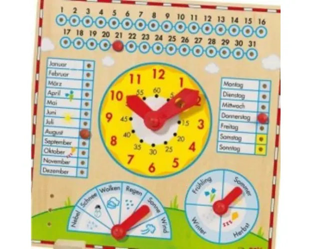 Calendar cu ceas Copiii invata prin intermediul acestui joc: anotimpurile, lunile anului, zilele saptamanii, toate in limba germana, precum si orele, minutele, chiar si vremea. Dimensiune: 35 x 35 cm Jocul ajuta la dezvoltarea miscarilor fine si a preciziei, dezvolta capacitatea de asociere si potrivire, coordonarea ochi mana si identificarea relatiilor de marime.Este un joc foarte util pentru uz individual sau pentru utilizarea in colectivitati - gradinite, scoli, activitati after-school. Produsul cu denumirea Calendar cu ceas face parte din brandul Goki, se afla in categoria Spatii de joaca din lemn si subcategoria