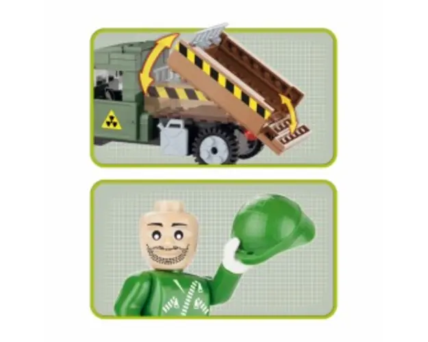 Setul contine: 150 de piese compatibile cu alte marci, 2 figurine, instructiuni de asamblare. Dimensiune camion L x h = 16 x 8 cm. Piese mobile: bena, roti, portiere, oblon bena. Dimensiuni: 23.5 x 5.5 x 20 cm Produsul cu denumirea Camion militar - Cobi face parte din brandul Cobi, se afla in categoria Cobi si subcategoria