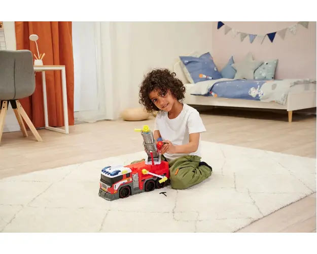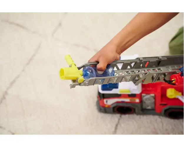 Caracteristici: Camion de pompieri Dickie cu sirena, luminite si scara extensibila perfect pentru micutii pasionati de vehicule utilitare Daca undeva izbucneste un incendiu, micii pompieri instruiti se urca in masina de pompieri pentru a stinge flacarile cu furtunul de apa de pe acoperis care are un rezervor de apa detasabil la bord Rezervorul alimenteaza sistemul de pulverizare cu apa pentru stingere si poate fi actionat usor. Masina de pompieri are, de asemenea, o scara extensibila, tun lateral, brat de prindere, functie sageata, lumini albastre si sunet de sirena. Baterii: 2x 1.5V R6 incluse. Produsul cu denumirea Camion de pompieri Dickie cu sirena, luminite si scara extensibila face parte din brandul Disquise, se afla in categoria Jucarii magnetice si subcategoria