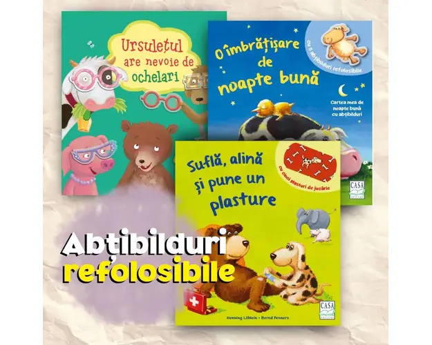 Am reusit, am depasit tot greul:oita, maimutica si ursuletul,elefantelul si catelul toate animalele sunt acum iar binesi de la pozne nu se pot abtine…? Abtibildurile se lipesc pe suprafetele netede. Pot fi dezlipite cu usurinta si refolosite denenumarate ori. Clateste-le in apa rece pentru a le improspata stratul adeziv. Produsul cu denumirea Carti pentru copii - Sufla, alina si pune un plasture face parte din brandul Editura aquila 93, se afla in categoria Carti copii romana si subcategoria Editura casa