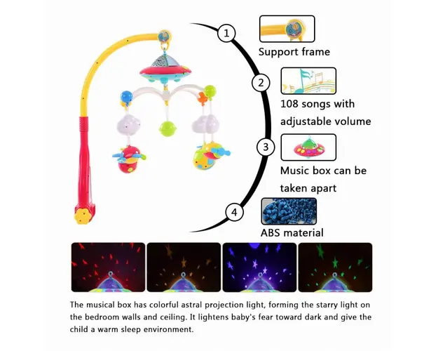 Caruselul Dreamful Bed Ring dotat cu melodii si proiector de lumini de diferite culori creaza o atmosfera linistitoare in camera bebelusuluinbspSe poate transforma din carusel in cutie muzicala cu Produsul cu denumirea Carusel muzical cu proiectii Dreamful Bed Ring face parte din brandul Nip, se afla in categoria Costume carnaval copii si subcategoria