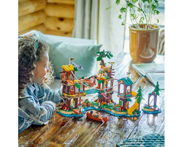 Setul de camping LEGO® Friends Casa din copac din tabara de aventuri (42631) conţine o mulţime de poveşti pentru fete şi baieţi de 8+ ani. Copiii pot spune povestea in care prietenii Leo, Aliya, Jamila şi Olly incearca activitaţi noi sub indrumarea consilierului de tabara Jonathan.Setul de construcţie este plin cu dotari distractive pentru joaca creativa şi include 5 minipapuşi, accesorii şi multe figurine animale, intre care 2 castori care construiesc un baraj. Trimite personajele intr-o tura rapida cu tiroliana sau ajuta-le sa parcurga circuitul cu obstacole, care are un pod din buşteni, un perete de escalada şi trape. şi alte activitaţi aşteapta sa fie explorate, cum ar fi mersul cu caiacul, precum şi o insula pe care se ajunge cu barca sau cu tiroliana.Micul tau explorator poate conduce personajele intr-o vanatoare de insecte. Vor gasi toate creaturile ascunse şi obţine insigna? Atenţie la veveriţa adorabila care şi-a construit propria ascunzatoare in copac, dotata chiar şi cu pat! Acest set este o idee grozava de cadou pentru fetele şi baieţii care indragesc jucariile şi seturile cu casuţe in copac. Produsul cu denumirea Casa din copac din tabara de aventuri face parte din brandul Coletto, se afla in categoria Jucarii outdoor si subcategoria Produse noi