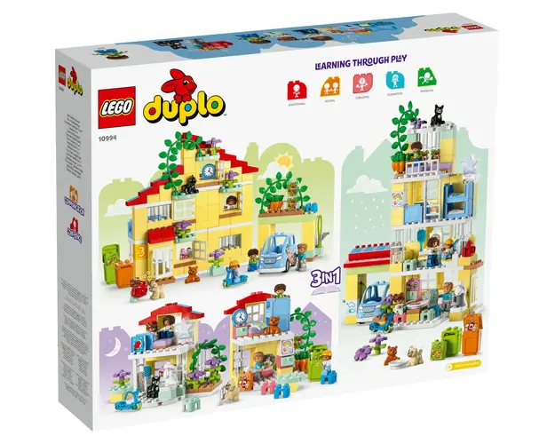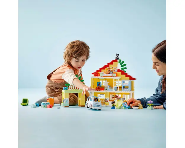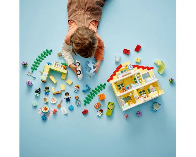 Bun-venit la LEGO® DUPLO® Oraşul meu Casa de familie 3 in 1 (10994), unde o lume a invaţarii ii aşteapta pe copii. Plina cu detalii autentice, aceasta casa permite copiilor de 2+ ani şi parinţilor sa interpreteze momente preţioase de familie. Cu 7 figurine incluse in set, parinţii vor petrece momente placute invaţandu-i pe cei mici abilitaţile sociale, in vreme ce aceştia vor exersa exprimarea de sine.Pentru copiii care adora sa se joace de-a familiaAceasta casa de jucarie include o gama larga de oportunitaţi de invaţare pentru cei mici. Copiii pot interpreta obiceiuri de dinainte de culcare, intre care spalatul pe dinţi şi citirea poveştii de seara in patul suprapus, in care pot crea o atmosfera placuta folosind caramida luminoasa din lampa in forma de stea. Ei invaţa despre alimentaţia sanatoasa in bucatarie sau culegand roşiile şi morcovii din gradina. In garaj se afla o maşina electrica construibila, „alimentata” de panouri solare, dotata cu o funcţie interesanta de activare prin impingere pentru joaca dinamica.O construcţie cu adevarat creativaCasa poate fi construita in 3 moduri pentru a pastra prospeţimea momentelor de joaca. Micuţii pot construi fie o casa mare cu 3 niveluri, o cladire inalta, sau 2 locuinţe mai mici, conectate printr-o gradina. Produsul cu denumirea Casa familiei 3in1 face parte din brandul Coletto, se afla in categoria Jucarii outdoor si subcategoria Produse noi