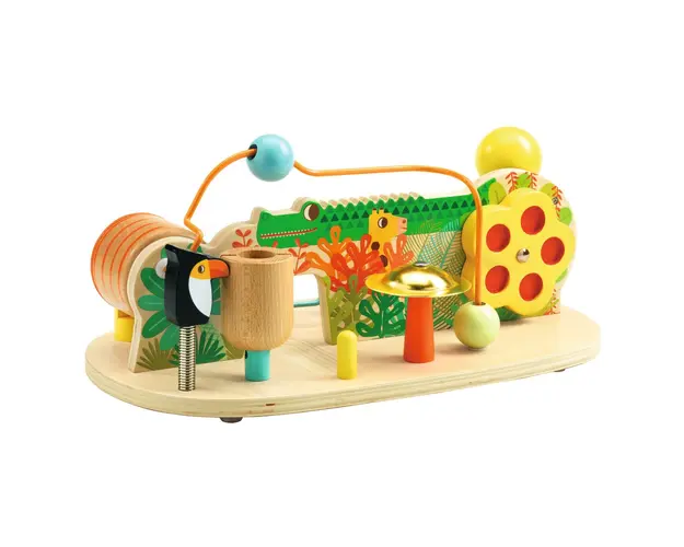 Centru de activitati cu multi sunete Multi Sound este o jucarie cu 8 activitati sonore, rezistenta la socuri. Copilul se misca in jurul ei pentru a se juca si a descoperi cele 8 sunete diferite care provin de la: papagalul elastic pe un cilindru de lemn, roata care se invarte, bila de-a lungul spatelui crocodilului, cilindrul rotativ, bila care cade pe tinbal la sfarsitul cursei, bila de pe elastic care atinge tamburina, bila mare care coboara pe toboganul de metal si discurile care se ciocnesc.Opt activitati sonore in jurul crocodilului. Continut: o baza asamblata din lemn cu o bila din lemn. Dimensiune jucarie: 35 x 14 x 20,5 cm. Confectionat din lemn si metal. Conform reglementarilor EN71&ASTM.Varsta recomandata: +18 luni. AVERTISMENT: Contraindicat copiilor sub 18 luni. A se utiliza sub directa supraveghere a unui adult. Producator: Djeco, Franta. Produsul cu denumirea Centru de activitati cu multi sunete, Djeco face parte din brandul Recaro, se afla in categoria Jucarii copii si jocuri educative si subcategoria