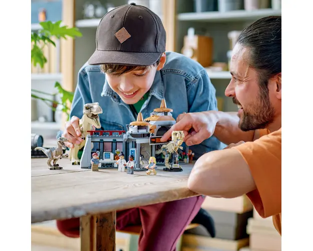 Data lansarii: 1 Iunie 2023Retraieşte scene dramatice din Jurassic Park cu setul de colecţie pentru joaca şi etalare Centru pentru turişti: T. rex şi raptor la atac (76961) din caramizi LEGO®, destinat copiilor de 12 ani şi mai mari. Arhitectura caracteristica a Centrului pentru turişti este surprinsa in stil LEGO, iar holul de la intrare, bucataria/zona de dining şi laboratorul sunt separate prin paravane semitransparente, cu imagini grafice reprezentand dinozauri. Plaseaza scheletul de T.rex construibil in holul de la intrare şi fa bannerul cu inscripţia „When dinosaurs ruled the Earth” sa cada la lovirea unui declanşator in timpul infruntarilor dintre figurinele articulate T.rex şi Velociraptor.O minunata idee de cadou pentru orice fan Jurassic Park, setul include 6 minifigurine LEGO dr. Ellie Sattler, dr. Alan Grant, Ray Arnold, dr. Henry Wu, Lex Murphy şi Tim Murphy şi o mulţime de accesorii care inspira joaca.Aplicaţia LEGO Builder ofera un mod convenabil de a pastra instrucţiunile in ordine. Foloseşte-o ca sa apropii şi sa roteşti modelele in 3D, sa salvezi seturi, sa-ţi monitorizezi progresul şi sa gaseşti inspiraţie pentru noi construcţii. Produsul cu denumirea Centru pentru turisti: T.rex si Raptor face parte din brandul Coletto, se afla in categoria Lego jurassic world si subcategoria