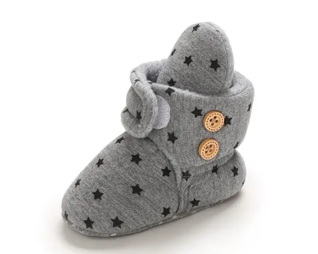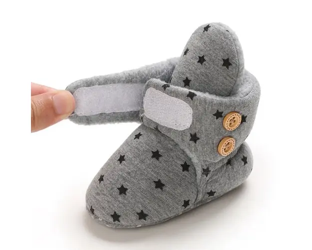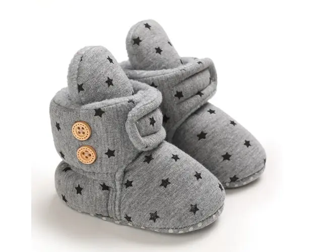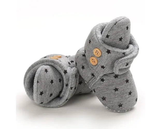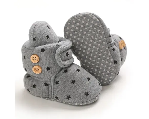 Marimi: 3-6 luni (lungime talpita la interior 10,5 cm, exterior 11 cm) 6-9 luni (lungime talpita la interior 11,5 cm, exterior 12 cm) 9-12 luni (lungime talpita la interior 12,5 cm, exterior 13 cm) Cizmulite pentru bebelusi, din material textil, dublate pe interior cu material tip polar, imprimate cu stelute negre. Au aplicati 2 nasturei intr-o parte, se inchid cu bareta lata arici pe mijloc facilitand incaltarea cu usurinta. Culoare: gri Talpa este din material textil cu inscriptie antiderapanta. Produsul cu denumirea Cizmulite gri cu stelute negre si cu nasturei face parte din brandul Eurobaby, se afla in categoria Barbie si subcategoria