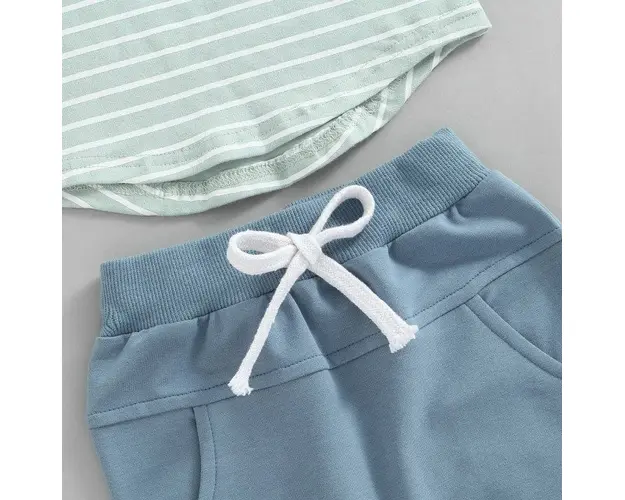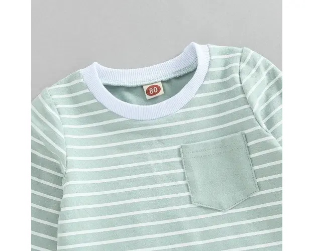 Marimi: 0-3(70), 3-6 (80), 6-9(90), 9-12(100), 12-18(110) luni Material: 95% Bumbac, 5% spandex Compleu pentru baietei, format din bluza verde cu dungi albe, cu buzunarel aplicat pantalonasi albastri prevazuti cu banda elastica in talie. INTRETINERE: Se spala la masina la 40 impreuna cu alte culori similare si se calca pe dos. Nu se aplica inalbitori si nu se usuca la masina. Culorile produselor pot varia in functie de monitorul calculatorului si calibrarea acestuia. Produsul cu denumirea Compleu pentru baietei face parte din brandul Eurobaby, se afla in categoria Tampoane de san si subcategoria