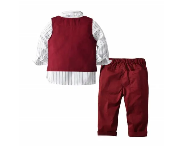 Marimi: 6-9 (80), 9-12 (90), 12-18 (100), 18-24 (110), 24 luni (120), 3 ani (130) Recomandam a se comanda dupa dimensiuni nu dupa varsta copilului. Varsta orientativa Lungime camasa Bust Lungime Pantaloni Ce scrie pe eticheta (nu reprezinta inaltimea copilului) 6-9 luni 35cm 58cm 43cm 80 9-12 luni 37cm 60cm 47cm 90 12-18 luni 39cm 62cm 51cm 100 18-24 luni 42cm 64cm 54cm 110 2 ani 45cm 66cm 58cm 120 3 ani 48cm 68cm 63cm 130 Material: 95% Bumbac, 5% elastane Costum elegant pentru baietei format din 4 piese: - camasuta alba cu dungulite negre, cu maneca lunga care se inchide cu nasturei in fata ; - pantaloni visinii, prevazuti cu buzunare si elastic in talie; - vestuta visinie; - papion in carouri visinii si verzi. Este ideal pentru ocaziile deosebite din viata micutului. Produsul cu denumirea Costum elegant cu vestuta visinie face parte din brandul Sevibebe, se afla in categoria Tampoane de san si subcategoria