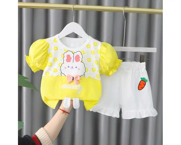 Marimi: 6-9, 9-12, 12-18 luni, 2, 3 ani Material: 95% bumbac, 5% polyester Set pentru fetite, format din: - bluzita alb cu galben, cu manecute scurte, imprimata cu un iepuras dragalas in fata; - pantalonasi scurti albi, prevazuti cu elastic in talie, cu un morcov aplicat. Pantofiorii din imagine sunt cu titlu de prezentare si nu sunt inclusi in pret. Produsul cu denumirea Costumas cu bluzita si pantalonasi scurti - Sweety Rabbit face parte din brandul Eurobaby, se afla in categoria Prepararea hranei si subcategoria