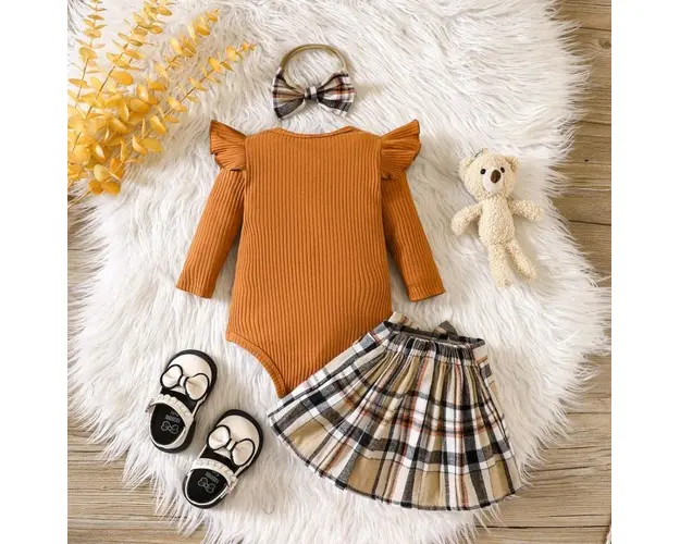 Costumas cu body maro si fustita in carouri - Teddy