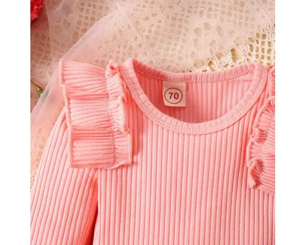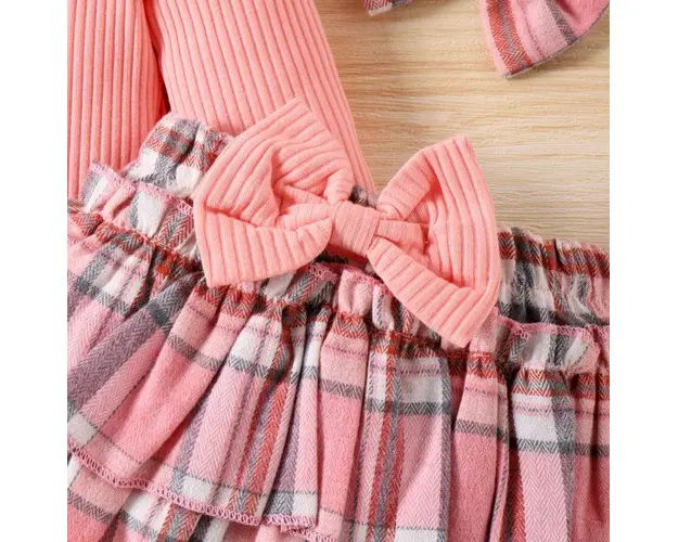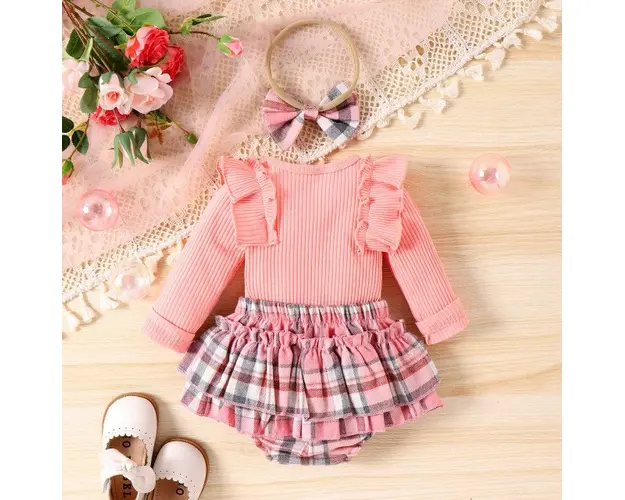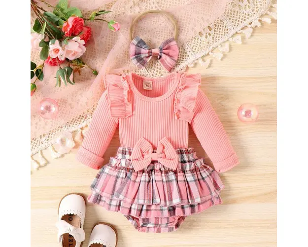 Marimi: 0-3 (70), 3-6 (80), 6-9 (90), 9-12 (100) luni Material: 95% Bumbac, 5% spandex Costumas pentru fetite, din 3 piese format din: - body roz cu maneca lunga, se inchide cu capse intre picioruse; - chilotei bufanti, in carouri, prevazuti cu elastic si cu o funda aplicata in talie; - bentita asortata. Pantofiorii din imagine sunt cu titlu de prezentare si nu sunt inclusi in pret. Produsul cu denumirea Costumas cu body roz pentru fetite - Lolita face parte din brandul Eurobaby, se afla in categoria Tampoane de san si subcategoria