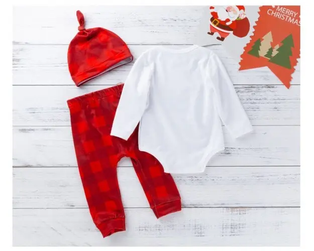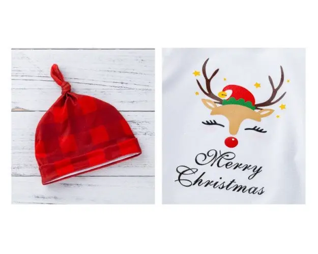 Marimi: 3-6, 6-9, 9-12, 12-18 luni Material: 95% Bumbac, 5% spandex Costumas din 3 piese format din: - body alb cu maneca lunga, cu inscriptie "Merry Christmas" si cu un cap de ren imprimat, se inchide cu capse intre picioruse; - pantalonasi caramizii in carouri, prevazuti cu elastic in talie; - caciulita tip piticot. Produsul cu denumirea Costumas din 3 piese pentru bebelusi - Renul timid face parte din brandul Eurobaby, se afla in categoria Cadite si articole pentru baie si subcategoria
