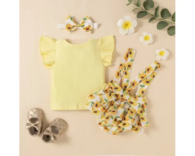 Marimi: 0-3, 3-6, 6-9, 9-12 luni Material: 95% bumbac, 5% spandex Set pentru fetite, format din: - bluzita galbena cu manecute scurte; - salopeta cu chilotei bufanti, alba, imprimata cu floarea soarelui; - bentita asortata cu salopeta. Pantofiorii din imagine sunt cu titlu de prezentare si nu sunt inclusi in pret. Produsul cu denumirea Costumas cu tricou galben - Floarea soarelui face parte din brandul , se afla in categoria Prepararea hranei si subcategoria