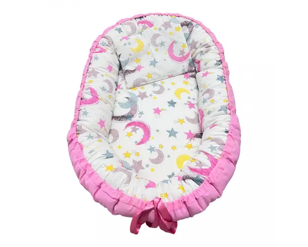 Cuib bebe si salteluta de joaca Croitoria Noastra cu perna slim Stelute cu luna roz