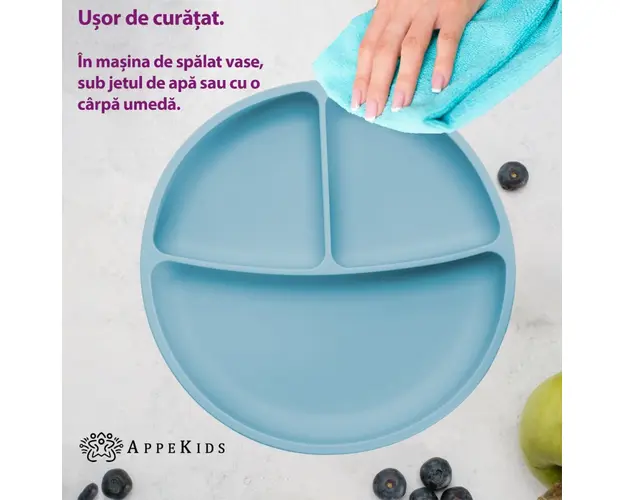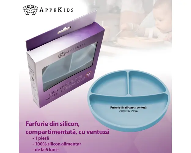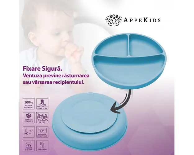 Suntem parinti si intotdeauna ne-am dorit tot ceea ce este mai bun pentru copiii nostri si ai tai.nbspStim ca toti parintii sunt ocupati si coplesiti de cotidian si ca isi doresc si ei cateva momente Produsul cu denumirea Farfurie compartimentata din silicon cu ventuza AppeKids Aqua Blue face parte din brandul Mykids, se afla in categoria Animale si subcategoria
