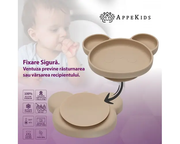 Suntem parinti si intotdeauna ne-am dorit tot ceea ce este mai bun pentru copiii nostri si ai tai.nbspStim ca toti parintii sunt ocupati si coplesiti de cotidian si ca isi doresc si ei cateva momente Produsul cu denumirea Farfurie din silicon cu ventuza AppeKids Panda Bubble Beige face parte din brandul Mykids, se afla in categoria Animale si subcategoria