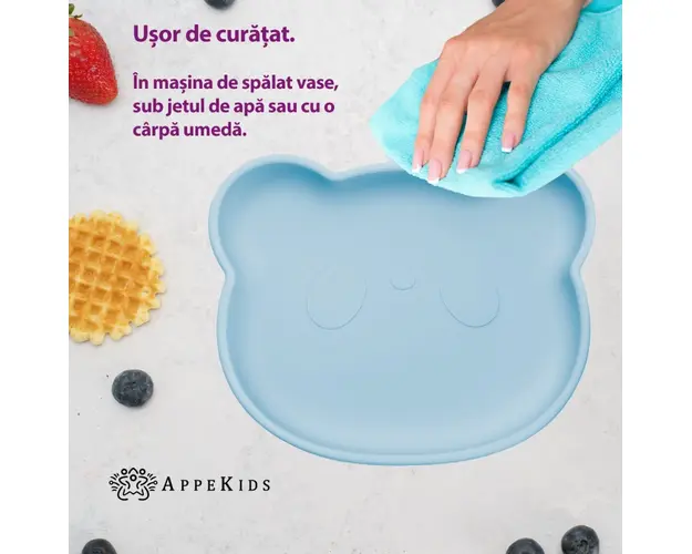 Suntem parinti si intotdeauna ne-am dorit tot ceea ce este mai bun pentru copiii nostri si ai tai.nbspStim ca toti parintii sunt ocupati si coplesiti de cotidian si ca isi doresc si ei cateva momente Produsul cu denumirea Farfurie din silicon cu ventuza AppeKids The Little Bear Aqua Blue face parte din brandul Mykids, se afla in categoria Animale si subcategoria