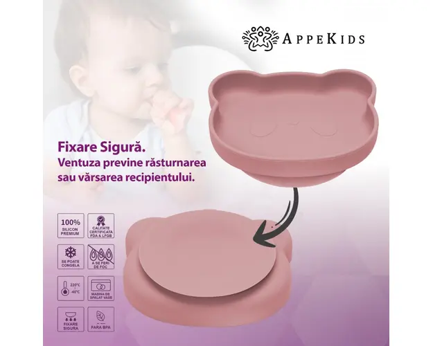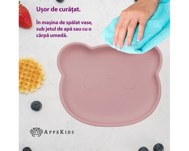Suntem parinti si intotdeauna ne-am dorit tot ceea ce este mai bun pentru copiii nostri si ai tai.nbspStim ca toti parintii sunt ocupati si coplesiti de cotidian si ca isi doresc si ei cateva momente Produsul cu denumirea Farfurie din silicon cu ventuza AppeKids The Little Bear Old Rose face parte din brandul Mykids, se afla in categoria Animale si subcategoria
