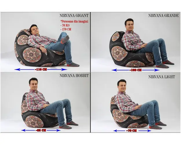 Pentru a descrie cat mai bine confortul pe care ti-l da modelul Nirvana Grande, am solicitat cate o parere de la fiecare dintre colegi.In final, ne-am dat seama ca... e foarte greu sa descrii confortu Produsul cu denumirea Fotoliu puf tip sac nirvana grande panama aqua pretabil si la exterior umplut cu perle polistiren face parte din brandul Pufrelax, se afla in categoria Costume carnaval copii si subcategoria
