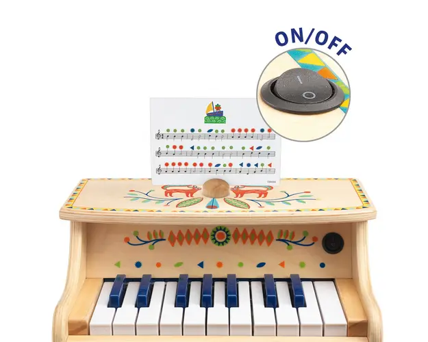 Pian Djeco Pian electronic din lemn cu ilustratii frumoase de Magali Attiogbé, conceput pentru copii, cu 18 clape. Copiii pot folosi partiturile pentru a canta 4 melodii internationale sau pot compune propriile piese. Fiecare nota de pe claviatura are propriul semn colorat, identic cu semnul de pe partitura. Dimensiuni pian 33 x 24,7 x 28 cm. Varsta recomandata: + 3 ani. Confectionat din lemn, materiale si culori non toxice conform reglementarilor EN71 & ASTM. Certificat FSC®.AVERTISMENT: Contraindicat copiilor sub 2 ani. A se utiliza strict sub supravegherea unei persoane adulte.Producator: Djeco, Franta. Produsul cu denumirea Instrument muzical Pian electronic Djeco face parte din brandul Recaro, se afla in categoria Jucarii muzicale bebe si subcategoria