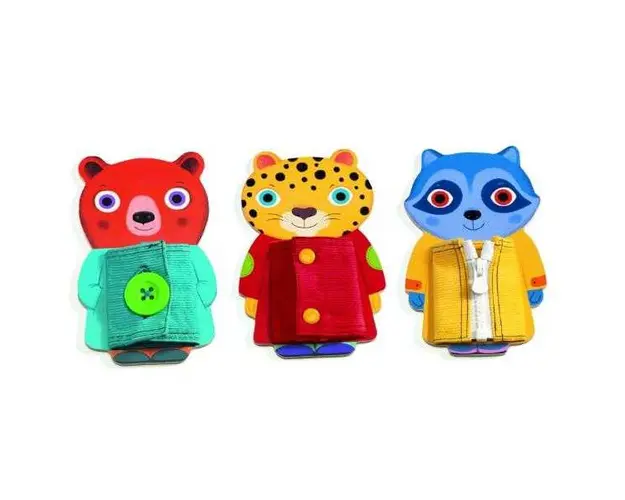 Sisteme de inchidere Ziptou - Un joc de manualitate cu trei animale dragute din lemn: un leopard, un urs si un raton. Copiii se pot antrena sa incheie si sa desfaca hainele micilor figurine. Trei tipuri de inchideri: capse, nasturi si fermoar. Copiii invata miscarile de zi cu zi. Ajuta la dezvoltarea motricitatii fine, a coordonarii ochi-mana.Continut: 3 animale din lemn cu haine de imbracat (textil, plastic, metal). Varsta recomandata: +3 ani. Confectionat din lemn, textil, plastic, metal. Conform reglementarilor EN71&ASTM. Certificare FSC®.AVERTISMENT: Contraindicat copiilor sub 3 ani. A se folosi sub directa supraveghere a unei persoane adulte.Producator: Djeco, Franţa. Produsul cu denumirea Joc educativ Ziptou, Djeco face parte din brandul Recaro, se afla in categoria Grafix si subcategoria Produse noi