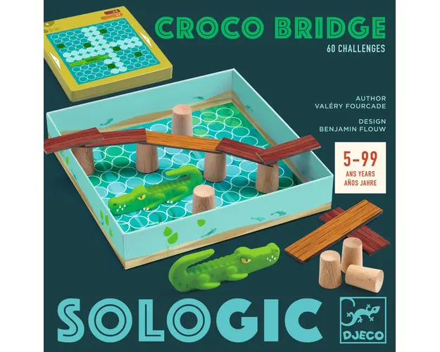 Joc de logica Podul crocodilului este un joc captivant care combina logica, strategia si reflectia. Jucatorii trebuie sa descopere cum sa ajunga la malul indicat al raului fara a calca peste crocodili infometati! Cu o singura solutie posibila pentru fiecare provocare, acest joc ofera 3 niveluri de dificultate, dezvoltand rabdarea, logica si abilitatile de deductie.Continutul include: tabla de joc, 2 crocodili, 10 trunchiuri, 7 placi de scandura (5 mici si 2 mari), 30 de cartonase provocare cu doua fete. Varsta recomandata: 5-99 ani. Este destinat unui singur jucator si este fabricat din lemn certificat FSC®, plastic si carton.Nu lasa crocodilul sa te manance! O provocare captivanta pentru toti micii aventurieri! Produsul cu denumirea Joc de logica Podul crocodilului, Djeco face parte din brandul Recaro, se afla in categoria Grafix si subcategoria Produse noi