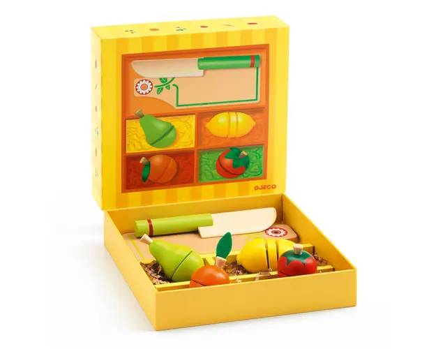 Gateste ca un adult, taind aceste frumoase fructe si legume din lemn folosind cutit si tocator, tot din lemn. Fiecare piesa are un atasament cu velcro (scai) pentru ore de distractie. Cutie din lemn masiv, robusta, colorata, usor de depozitat.Continut: tocator, cutit, 2 fructe si 2 legume.Varsta recomandata: +3 ani.Confectionat din lemn cu vopsele non toxice cu certificatre FSC®.AVERTISMENT! Contraindicat copiilor sub 3 ani. A se folosi sub directa supraveghere a unei persoane adulte.Producator: D jeco , Franta Produsul cu denumirea Joc de rol Fructe si legume de feliat, Djeco face parte din brandul Recaro, se afla in categoria Grafix si subcategoria Produse noi