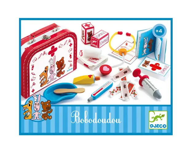 Trusa de doctor Djeco Bobodoudou este o trusa medicala care contine toate instrumentele necesare pentru ca jucariile dragalase sa revina la sanatate. Toate accesoriile pot fi depozitate in cutie. Un joc de rol pentru ca cei mici sa se distreze imitand adultii.Continut: gentuta tip valiza, 1 seringa din lemn, 1 termometru din lemn, 1 depresor de limba din lemn, 1 stetoscop din lemn si plastic, 1 vas de plastic, 1 tub de crema, 6 pansamente elastice, 2 bandaje albe si 1 covoras din material textil, 1 retetar si 1 carnet cu fise medicale.Varsta recomandata: +4 ani. Confectionat din lemn cu certificare FSC®.AVERTISMENT! Contraindicat copiilor sub 3 ani. A se folosi sub directa supraveghere a unei persoane adulte. Produsul cu denumirea Joc de rol Trusa de doctor, Djeco face parte din brandul Recaro, se afla in categoria Grafix si subcategoria Produse noi