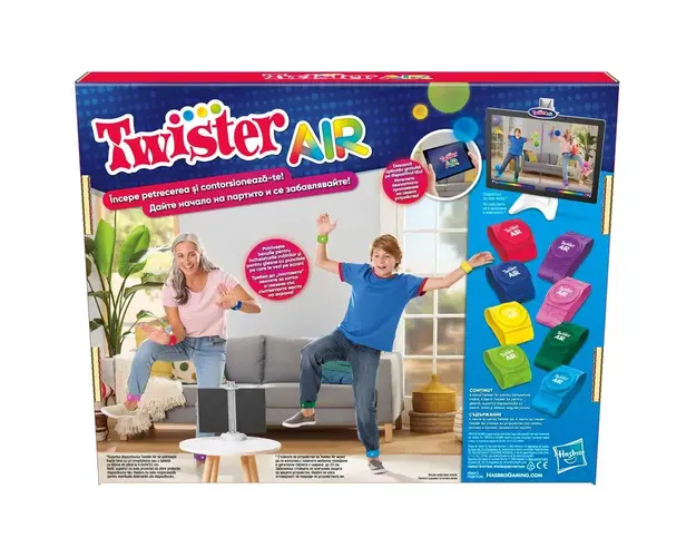 Caracteristici Joc de societate Hasbro Twister Air: Nu ai covoras? Nici o problema! Cu Twister Air activat de o aplicatie, petrecerea se muta pe dispozitivul tau inteligent Acest joc distractiv de petrecere include 8 benzi colorate Twister Air si un suport pentru dispozitiv mobil pentru orice smartphone sau tableta Pentru a incepe, descarca aplicatia Twister Air (se descarca gratuit - se pot aplica tarife de achizitie pentru date si in aplicatie) si plasati un dispozitiv inteligent pe suport Toti jucatorii trebuie apoi sa puna benzile pe incheieturi si glezne si sunt gata de actiune! Pe masura ce se aude muzica, miscati-va corpurile pentru a potrivi barele cu punctele colorate de pe ecran Atinge, gliseaza, bate din palme si vei ajunge in pozitii haioase Cu cat atingi mai multe pete de culoare, cu atat scorul este mai mare Obtine cele mai multe puncte pentru a castiga! Sau joaca solo si incearca sa-ti bati recordul Acest joc cu aplicatie si realitate augmentata Twister Air este o noua versiune captivanta a clasicului Twister si este perfect pentru o petrecere cu prietenii Descarca aplicatia din Apple App Store si Google Play Hasbro F8158 Produsul cu denumirea Joc de societate Hasbro Twister Air face parte din brandul Hasbro, se afla in categoria Jucarii magnetice si subcategoria