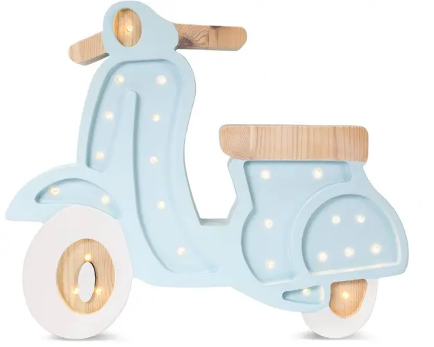 Lampa decorativa din lemn de pin, cu LED, lucrata manual, avand un design incantator, in forma unui scooter.Caracteristici LED cu lumina calda 2,2W alimentare la priza Intrare AC 100-240 Iesire DC 5V Produsul cu denumirea Lampa Little Lights Scuter Azzuro face parte din brandul Little tikes, se afla in categoria Costume carnaval copii si subcategoria