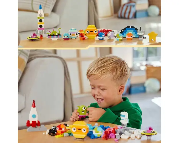 Caracteristici Lego Classic Planete Creative 11037: Jucaria LEGO® Classic Planete creative (11037) ii lanseaza pe micii astronauti si astronomi de 5+ ani intr-o calatorie a explorarii creative Kitul cu modele usor de construit, precum un sistem solar, un astronaut si o naveta spatiala, este ideal pentru copiii care doresc sa construiasca, sa se joace si sa ajunga cu indrazneala acolo unde niciun constructor LEGO n-a mai ajuns vreodata! Copiii asambleaza caramizile colorate pentru a construi o racheta, un extraterestru, un astronaut si un minisistem solar care include soarele si planetele Marte, Pamant si Saturn cu inelele sale Modelele spatiale pot fi personalizate prin utilizarea variantelor de culori, forme, ochi, expresii, iar un suport permite rotirea lor Setul include chiar si caramizi fotoluminescente pentru vizibilitate pe intuneric Creativitatea cosmica nu se opreste datorita sugestiilor pentru constructii alternative, intre care un sistem solar complet, din 8 planete Ghidurile si functiile digitale sunt disponibile in aplicatia LEGO Builder Jucariile LEGO Classic sunt pline de idei si inspiratie si dau ocazia parintilor sa se distreze construind alaturi de copiii lor si sa fie martori la etapele acestora de dezvoltare Numar de piese: 450 Dimensiuni racheta: 12 cm LEGO 11037 Produsul cu denumirea Lego Classic Planete Creative 11037 face parte din brandul Lionelo, se afla in categoria Jucarii magnetice si subcategoria