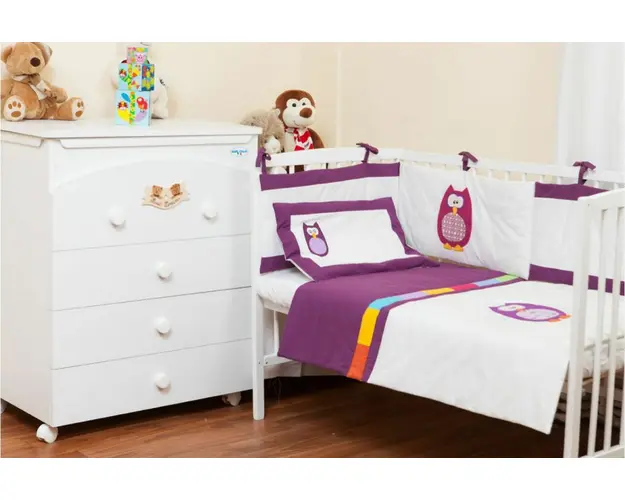 Lenjerie 3 piese pentru patut 60x120 cm Bufnite brodate mov