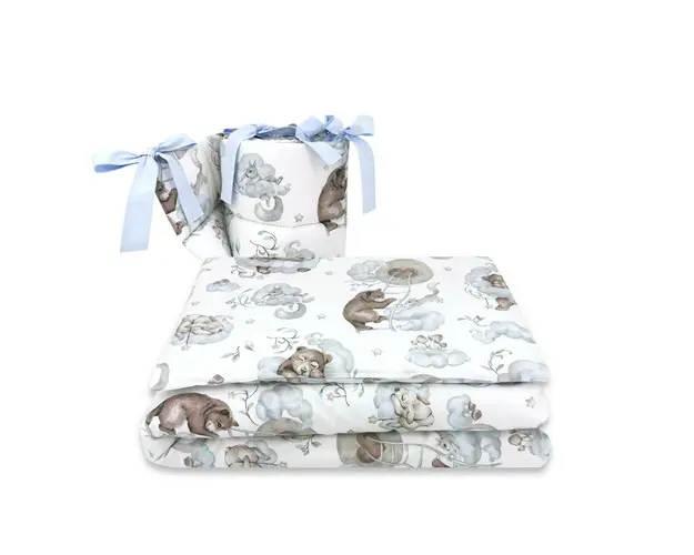 Lenjerie patut 3 piese Qmini cu protectie laterala din bumbac 140x70 cm Teddy Bear and Friends Blue