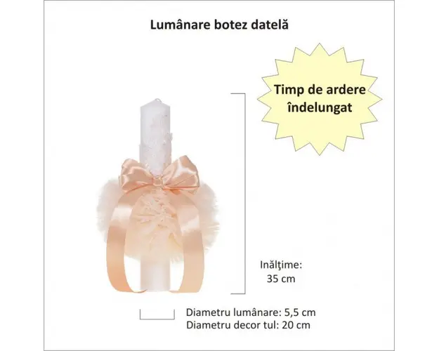 Lumanare botez glob cu dantela si trusou botez in landou, decor Ivoire cu floricele, Denikos® 755 DESCRIERE Set special creat pentru ceremonia de botez. Setul este alcatuit din trusou complet ambalat intr-o cutie tip landou si o lumanare decorata cu un glob din tul crem / ivoire, dantela si fundita asortata. Setul contine: - cutie de trusou in forma de landou; - prosop cu gluga pentru bebelus, dimensiuni 80 x 80 cm, 100% bumbac; - panza de mir, 100% bumbac; - prosop pentru preot, dimensiuni 30 x 50 cm, 100% bumbac; - fasa de botez, dimensiune 150 cm; - sticluta de mir, capacitate 100 ml; - sapunel in forma de bebelus; - cutiuta pentru suvita de par. - lumanare de botez (35 cm inaltime). PERSONALIZARE Trusoul se poate personaliza cu numele copilului. Numele copilului poate fi scris prin brodare pe prosopul copilului, panza si fasa (cost suplimentar). Daca doresti personalizare, alege la optiuni cu personalizare si te vom contacta telefonic pentru a stabili detaliile. Produsul cu denumirea Lumanare botez glob cu dantela si trusou botez in landou, decor Ivoire cu floricele, Denikos® 755 face parte din brandul Produs vandut si livrat de sc denikos creativ shop online srl, se afla in categoria Tetine si subcategoria