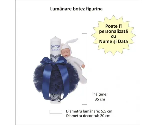 Lumanare botez cu iepuras, personalizata si trusou botez in landou, decor dantela Bleumarin, Denikos® 873 DESCRIERE Set special creat pentru ceremonia de botez. Setul este alcatuit din trusou complet ambalat intr-o cutie tip landou si o lumanare personalizata cu numele copilului decorata cu un glob din tul bleumarin, dantela, fundita asortata si o jucarie iepuras. Setul contine: - cutie de trusou in forma de landou; - prosop cu gluga pentru bebelus, dimensiuni 80 x 80 cm, 100% bumbac; - panza de mir, 100% bumbac; - prosop pentru preot, dimensiuni 30 x 50 cm, 100% bumbac; - fasa de botez, dimensiune 150 cm; - sticluta de mir, capacitate 100 ml; - sapunel in forma de bebelus; - cutiuta pentru suvita de par. - lumanare de botez (35 cm inaltime). Lumanarea de botez este personalizata cu numele bebelusului si / sau data botezului. Dupa plasarea comenzii te vom contacta pentru comunicarea datelor pentru personalizare. PERSONALIZARE Trusoul se poate personaliza cu numele copilului. Numele copilului poate fi scris prin brodare pe prosopul copilului, panza si fasa (cost suplimentar). Daca doresti personalizare, alege la optiuni cu personalizare si te vom contacta telefonic pentru a stabili detaliile. Produsul cu denumirea Lumanare botez cu iepuras, personalizata si trusou botez in landou, decor dantela Bleumarin, Denikos® 873 face parte din brandul Produs vandut si livrat de sc denikos creativ shop online srl, se afla in categoria Barbie si subcategoria
