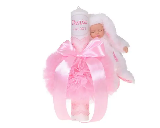Lumanare botez cu iepuras, personalizata si trusou botez in landou, decor Roz cu floricele, Denikos® 799