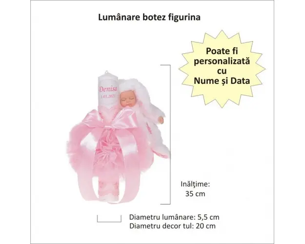 Lumanare botez cu iepuras, personalizata si trusou botez in landou, decor Roz cu floricele, Denikos® 799 DESCRIERE Set special creat pentru ceremonia de botez. Setul este alcatuit din trusou complet ambalat intr-o cutie tip landou si o lumanare personalizata cu numele copilului decorata cu un glob din tul roz, dantela, fundita asortata si o jucarie iepuras. Setul contine: - cutie de trusou in forma de landou; - prosop cu gluga pentru bebelus, dimensiuni 80 x 80 cm, 100% bumbac; - panza de mir, 100% bumbac; - prosop pentru preot, dimensiuni 30 x 50 cm, 100% bumbac; - fasa de botez, dimensiune 150 cm; - sticluta de mir, capacitate 100 ml; - sapunel in forma de bebelus; - cutiuta pentru suvita de par. - lumanare de botez (35 cm inaltime). Lumanarea de botez este personalizata cu numele bebelusului si / sau data botezului. Dupa plasarea comenzii te vom contacta pentru comunicarea datelor pentru personalizare. PERSONALIZARE Trusoul se poate personaliza cu numele copilului. Numele copilului poate fi scris prin brodare pe prosopul copilului, panza si fasa (cost suplimentar). Daca doresti personalizare, alege la optiuni cu personalizare si te vom contacta telefonic pentru a stabili detaliile. Produsul cu denumirea Lumanare botez cu iepuras, personalizata si trusou botez in landou, decor Roz cu floricele, Denikos® 799 face parte din brandul Produs vandut si livrat de sc denikos creativ shop online srl, se afla in categoria Tetine si subcategoria