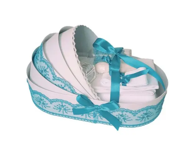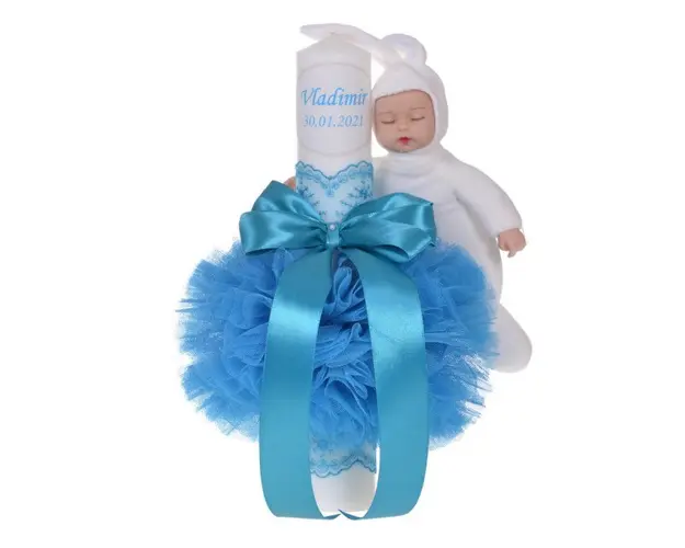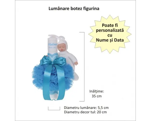 Lumanare botez cu iepuras, personalizata si trusou botez in landou, decor Turcoaz, Denikos® 796 DESCRIERE Set special creat pentru ceremonia de botez. Setul este alcatuit din trusou complet ambalat intr-o cutie tip landou si o lumanare personalizata cu numele copilului decorata cu un glob din tul turcoaz, dantela, fundita asortata si o jucarie iepuras. Setul contine: - cutie de trusou in forma de landou; - prosop cu gluga pentru bebelus, dimensiuni 80 x 80 cm, 100% bumbac; - panza de mir, 100% bumbac; - prosop pentru preot, dimensiuni 30 x 50 cm, 100% bumbac; - fasa de botez, dimensiune 150 cm; - sticluta de mir, capacitate 100 ml; - sapunel in forma de bebelus; - cutiuta pentru suvita de par. - lumanare de botez (35 cm inaltime). Lumanarea de botez este personalizata cu numele bebelusului si / sau data botezului. Dupa plasarea comenzii te vom contacta pentru comunicarea datelor pentru personalizare. PERSONALIZARE Trusoul se poate personaliza cu numele copilului. Numele copilului poate fi scris prin brodare pe prosopul copilului, panza si fasa (cost suplimentar). Daca doresti personalizare, alege la optiuni cu personalizare si te vom contacta telefonic pentru a stabili detaliile. Produsul cu denumirea Lumanare botez cu iepuras, personalizata si trusou botez in landou, decor Turcoaz, Denikos® 796 face parte din brandul Produs vandut si livrat de sc denikos creativ shop online srl, se afla in categoria Barbie si subcategoria